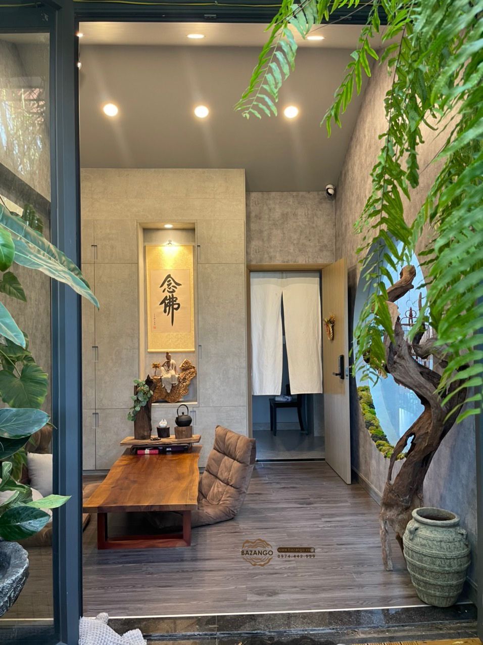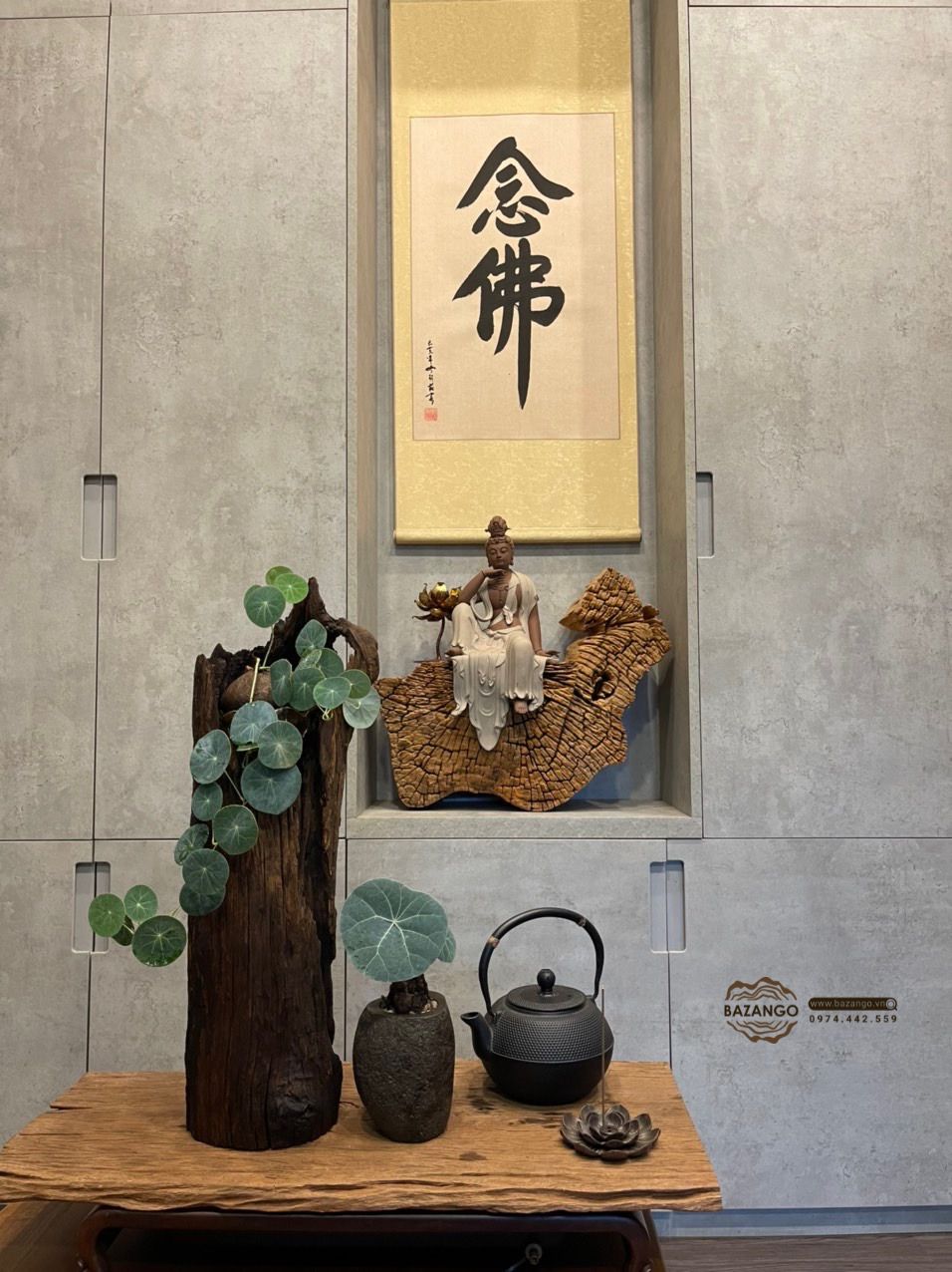 Góc trang trí trong phòng trà, một bụi cây nhỏ, Tượng Phật an nhiên....